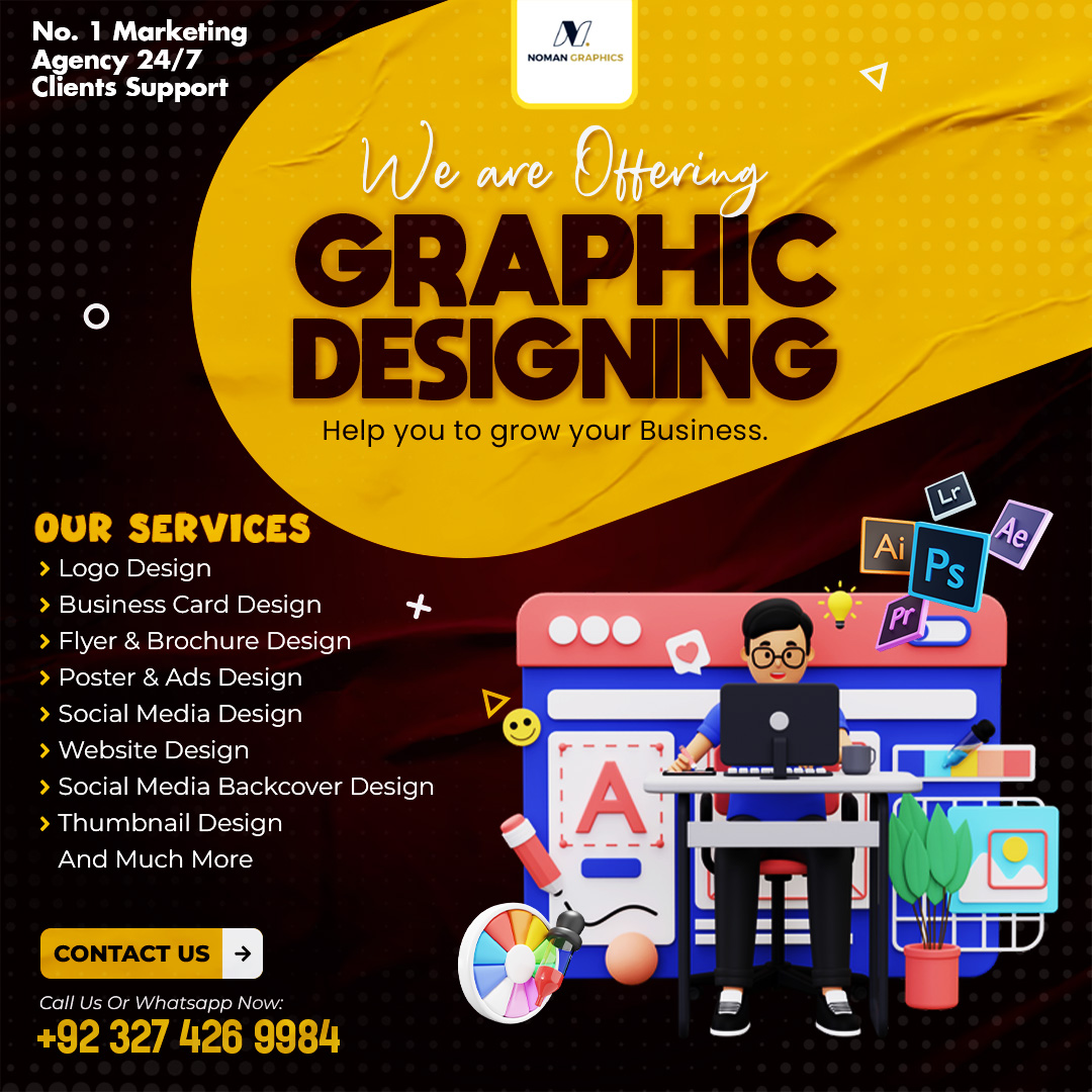 Welcome to Noman Graphicsβ portfolio, where creativity meets purpose! Our work is a blend of innovative design, storytelling, and strategic thinking aimed at bringing brands to life. From striking logos and captivating social media graphics to professional business cards, brochures, and digital ads, we specialize in creating visuals that leave a lasting impression.